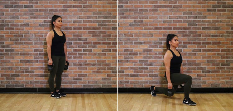 - Step forward with one leg, lowering your hips until both knees are bent at 90 degrees.