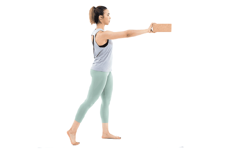 - Stand tall, holding a block in one hand out in front of you at shoulder height.