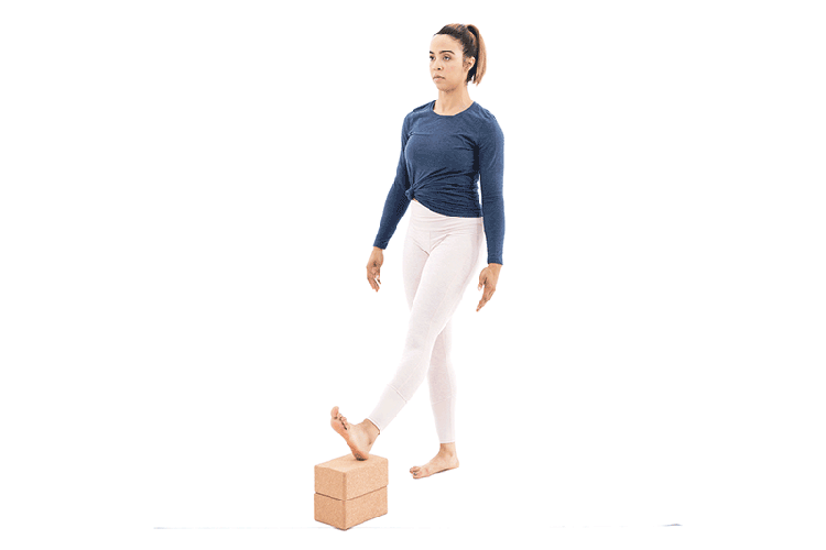 - Elevate your right leg by placing your foot on a stool or box. Keep a slight bend in your knee and point your toes toward your nose.