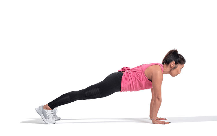 - Begin in a high plank with your hands under shoulders and your toes on the ground, forming one long line from head to heels.