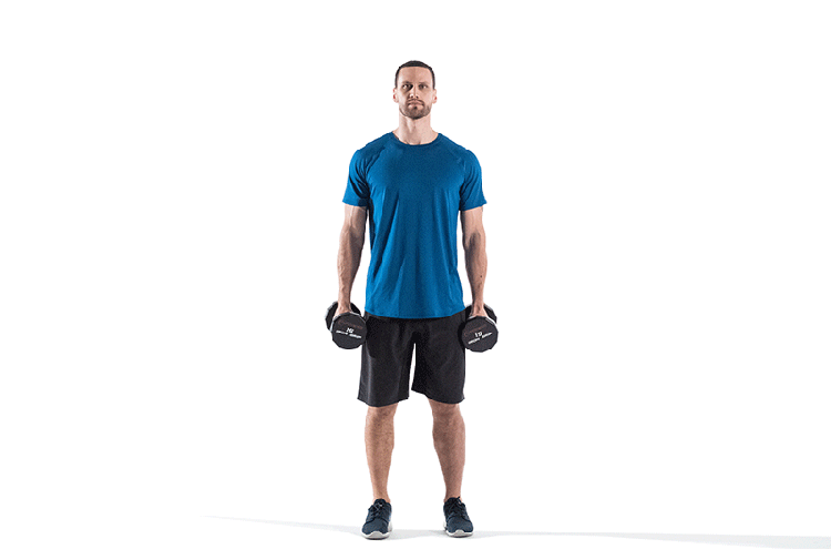 - Stand tall with a dumbbell in each hand and your arms at your sides, feet under your hips.