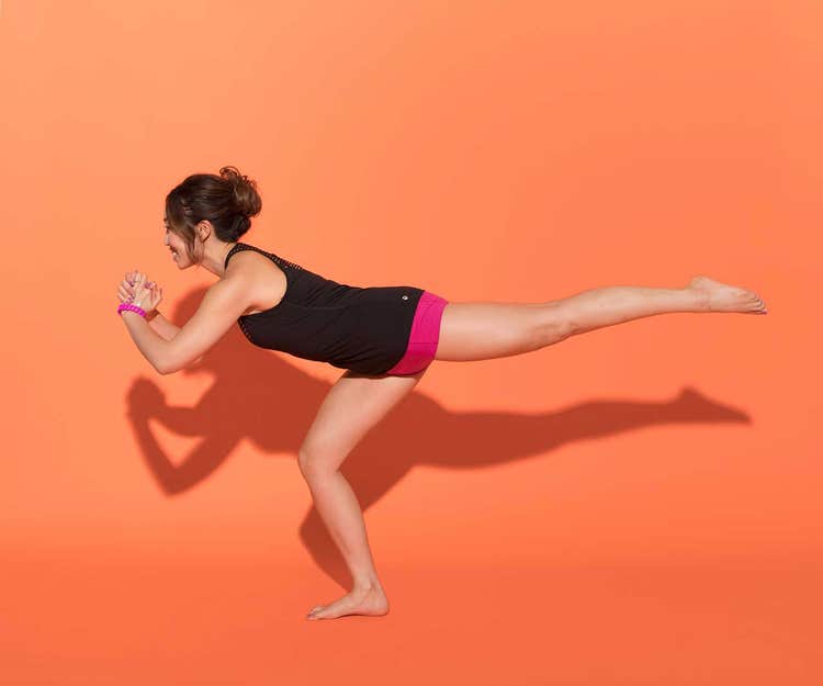- Hinge forward from your hips and raise your left leg directly behind you until your torso and left leg are parallel to the floor. Keep your right knee soft to help you balance.