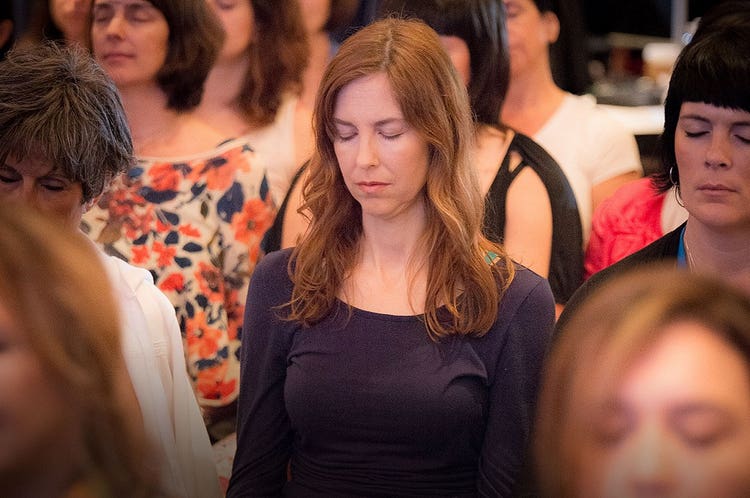 Next, our guide suggests we send that same compassion to people we’ve never met in countries far away, then everyone on the planet. The next five minutes are quiet, as we silently repeat a Sanskrit mantra for compassion, om karuna swaha. I am pulsating in this sea of meditators. It’s like time has stopped and we are suspended together in grace.