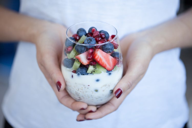 No time? Blend a banana, nut butter and milk for a balanced breakfast in a flash. Bananas supply a rich dose of potassium, which aids in maintaining muscle and nerve function. Milk and other dairy products are a rich source of protein to help build muscle and regulate appetite. Plus you’ll get a hefty dose of healthy from the nuts and seeds.